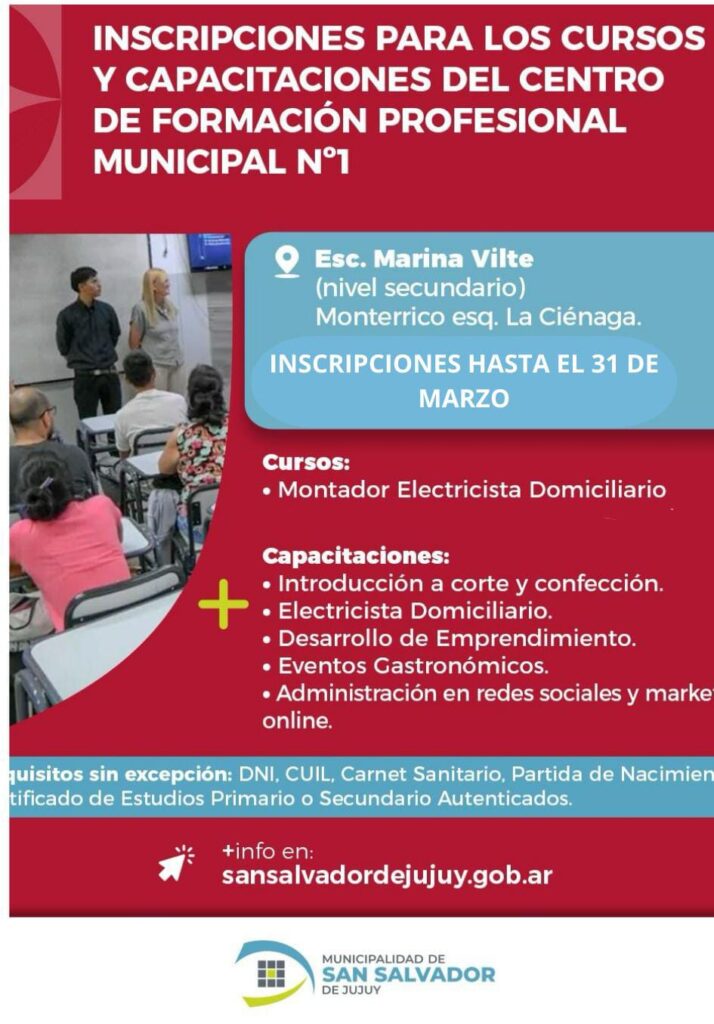 El Municipio anunció que el Centro de Formación Profesional N°1, ubicado en la Escuela Municipal Marina Vilte (Nivel Secundario), extendió el plazo de inscripción para sus cursos y capacitaciones. Los interesados podrán anotarse hasta el lunes 31 de marzo para participar de una amplia oferta educativa.