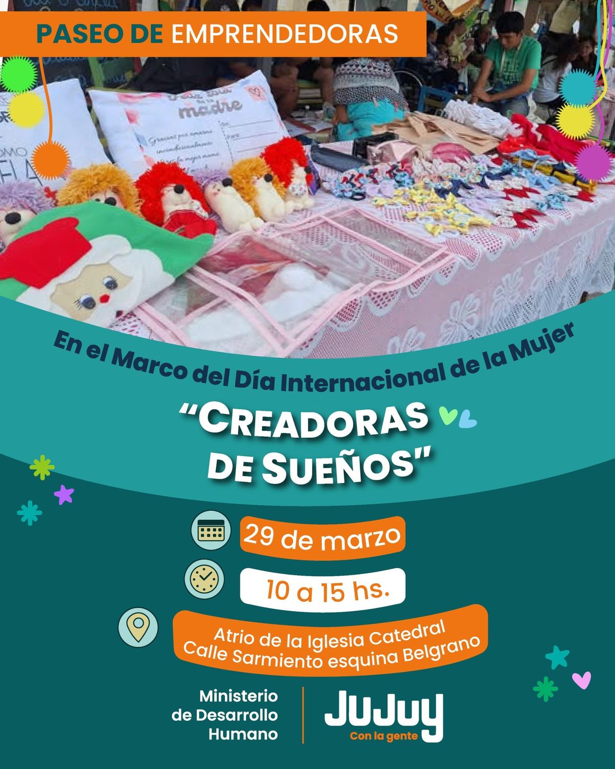 Desde el Ministerio de Desarrollo Humano de Jujuy, a través de la Secretaría de Desarrollo Integral y la Coordinación de Economía Comunitaria, se llevará a cabo este sábado 29 de marzo, el Paseo de Emprendedoras “Creadoras de Sueños”, en el marco del Día Internacional de la Mujer.