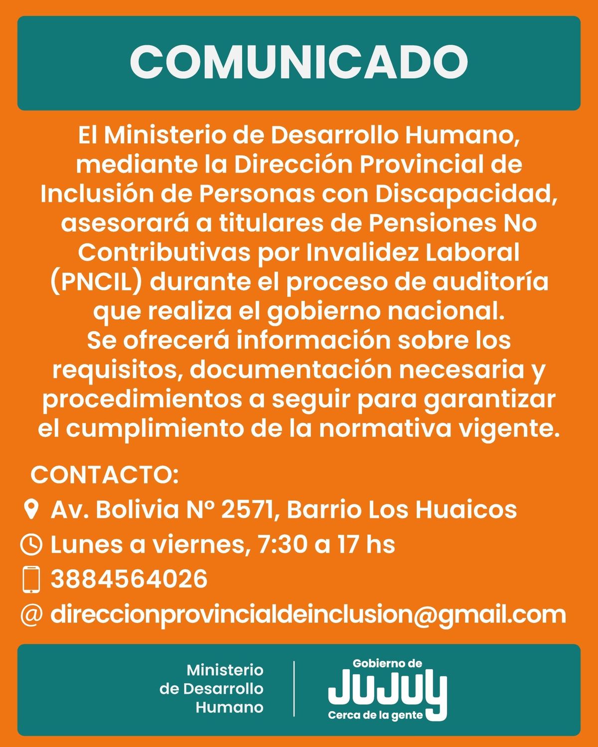 El Ministerio de Desarrollo Humano de Jujuy, a través de la Dirección Provincial de Inclusión de Personas con Discapacidad de la Secretaría de Desarrollo Integral, brindará asesoramiento a los beneficiarios de Pensiones No Contributivas por Invalidez Laboral (PNCIL) en el marco del proceso de auditoría implementado por el Gobierno Nacional.