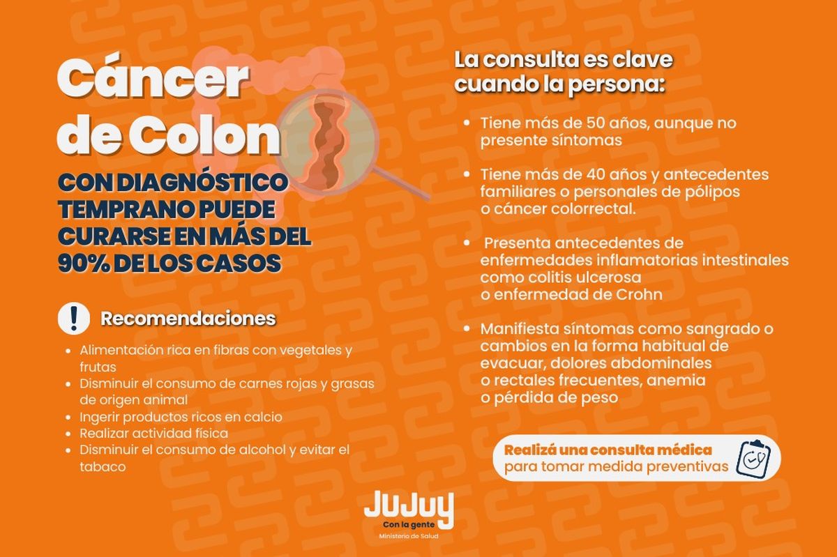 El Ministerio de Salud de Jujuy recordó a la población que, cada 31 de marzo se conmemora el Día Mundial del Cáncer Colorrectal, enfermedad que, aunque se puede prevenir, es el segundo cáncer más frecuente y el segundo de mayor mortalidad en Argentina, con más de 15 mil nuevos casos diagnosticados por año y más de 7.000 muertes anuales por esta causa.