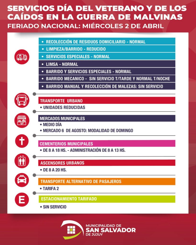 La Municipalidad de San Salvador de Jujuy informó la modalidad de prestación de servicios municipales el día miércoles 2 de abril con motivo del feriado en conmemoración al Día de Veterano y de los Caídos en la Guerra de Malvinas.