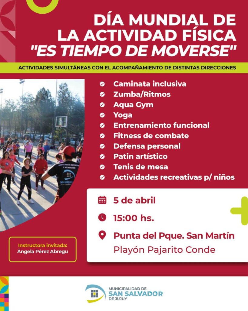 La Dirección de Deportes del Municipio anunció la celebración del Día Mundial de la Actividad Física con una serie de eventos que se desarrollarán el sábado 5 de abril. La actividad denominada “Es tiempo de moverse” se llevará a cabo en el Centro Deportivo N°1 del Parque San Martín desde las 15 hs. Además por la mañana los centros deportivos tendrán un encuentro para promocionar las propuestas deportivas en toda la ciudad.
