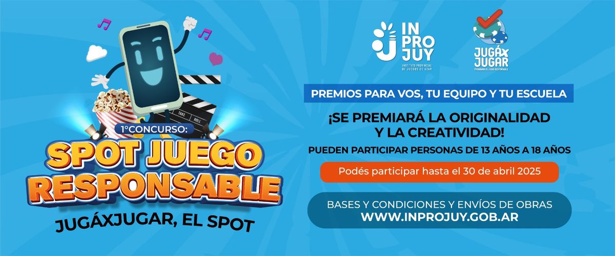 El Instituto Provincial de Juegos de Azar de Jujuy (INPROJUY) informa que se extendió el plazo para participar del Concurso de Spot Publicitario sobre “Juego Responsable” dirigido a estudiantes de 13 a 18 años que asisten a colegios de toda la provincia.
