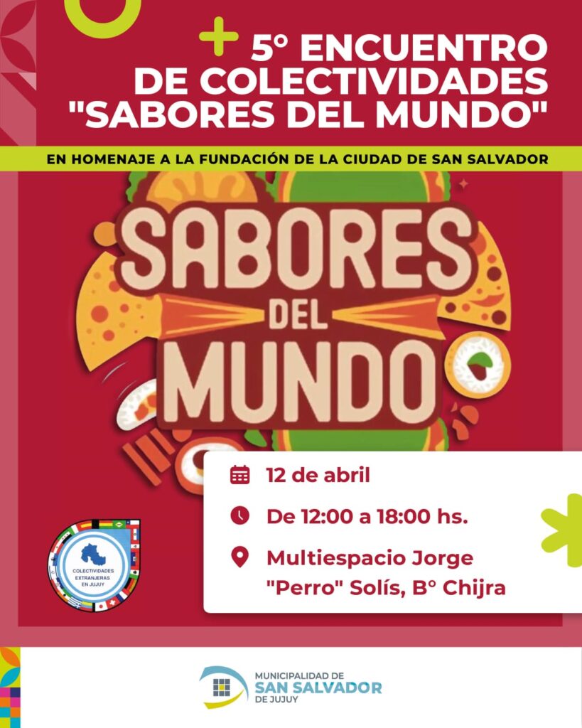 Este sábado 12 de abril, de 12 a 18 horas, el recientemente inaugurado Multiespacio Jorge “Perro” Solís, ubicado en el barrio Chijra, será sede del 5° Encuentro de Colectividades “Sabores del Mundo”. El evento, organizado por la Municipalidad de San Salvador de Jujuy —a través de la Dirección de Culto y Relaciones Institucionales, Nacionales e Internacionales— junto a las Colectividades Extranjeras en Jujuy y con el apoyo del Gobierno de la Provincia, invita a toda la comunidad a disfrutar de una jornada llena de cultura, gastronomía y danzas tradicionales.