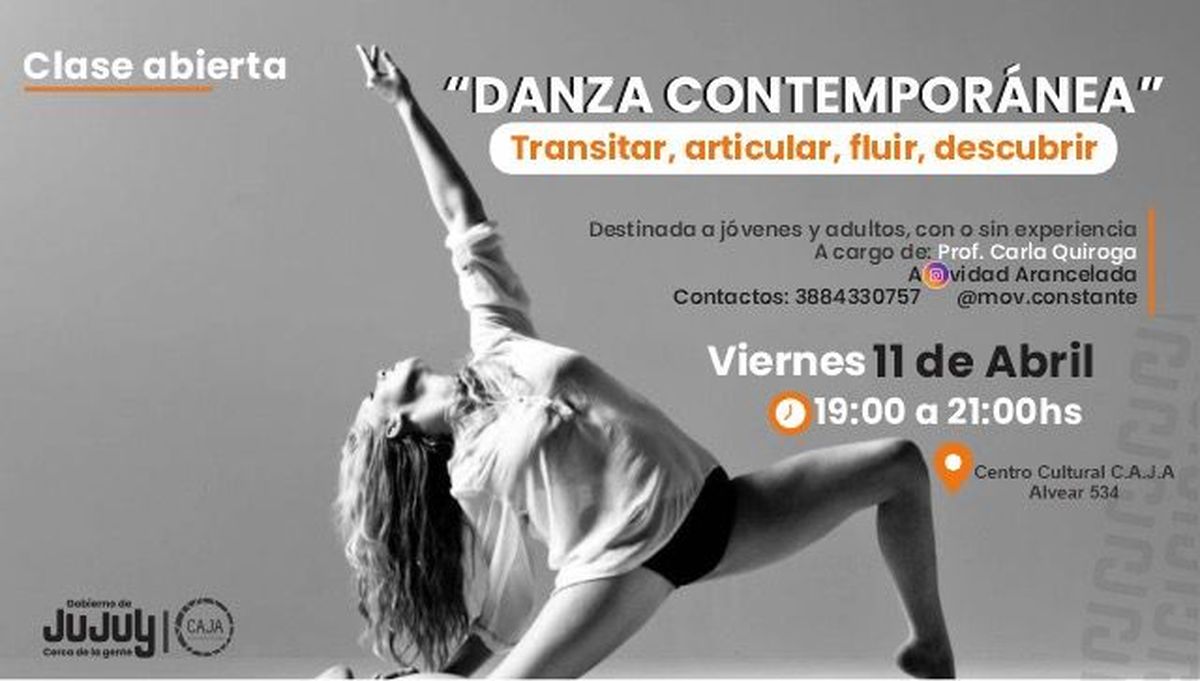 La danza contemporánea se consolida en la escena artística local como una de las expresiones más vibrantes y dinámicas. nte este creciente interés, la Secretaría de Cultura de Jujuy, en colaboración con el Centro de Arte Joven Andino (CAJA), invita a una clase abierta de danza contemporánea dirigida a jóvenes y adultos, con o sin experiencia previa