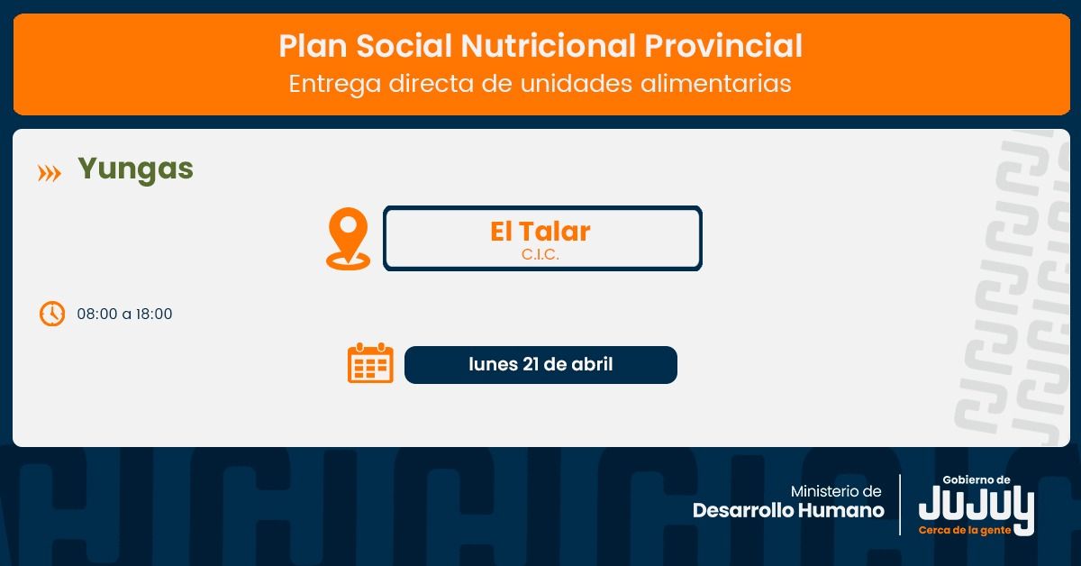 El Ministerio de Desarrollo Humano de Jujuy, por medio de la Secretaría de Asistencia Directa, comunica que desde el lunes 21 de abril, se concretará la entrega de refuerzos alimentarios del Programa “Comer en Casa”, a familias de Palma Sola, Vinalito y El Talar.