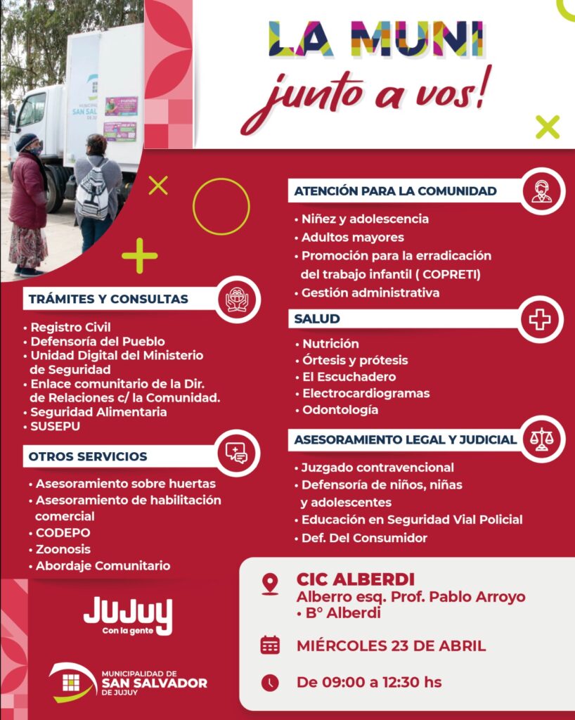 La Municipalidad de San Salvador de Jujuy invita a los vecinos del barrio Los Huaicos y zonas cercanas a participar de una nueva edición del operativo “La Muni junto a vos”, una jornada pensada para acercar trámites, asesoramiento y servicios esenciales a la comunidad. La actividad se llevará a cabo el miércoles 22 de abril, de 9 a 12:30 hs, en el CIC Alberdi, ubicado en Alberro esq. Pablo Arroyo .