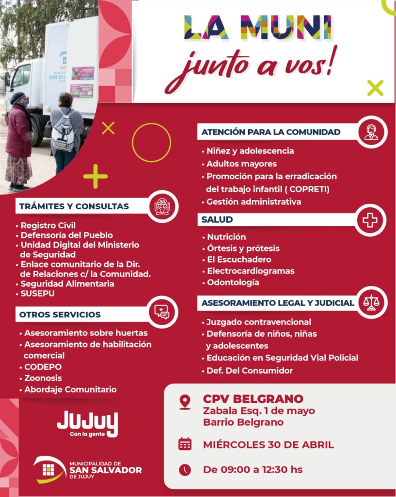 La Municipalidad de San Salvador de Jujuy invita a los vecinos del barrio Belgrano y zonas aledañas a participar de una nueva jornada del programa “La Muni Junto a Vos”, un operativo diseñado para acercar servicios esenciales, asesoramiento y trámites gratuitos a la comunidad. La actividad se realizará el miércoles 30 de abril, de 9 a 12:30 horas, en el Centro de Participación Vecinal (CPV) Belgrano, ubicado en la esquina de Zabala y 1° de Mayo.