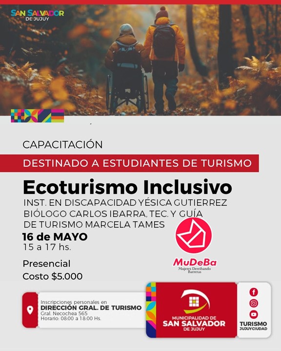 La Municipalidad de San Salvador de Jujuy, a través de la Dirección General de Turismo, invita a estudiantes de la carrera de Turismo y al público en general interesado a participar de una nueva capacitación titulada “Ecoturismo Inclusivo”, una propuesta formativa que busca integrar el enfoque ambiental con el respeto y la inclusión de personas con discapacidad.