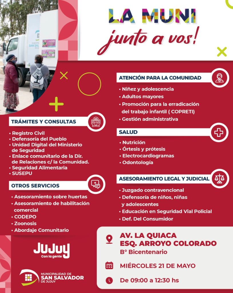 La Municipalidad de San Salvador de Jujuy invita a los vecinos del barrio Bicentenario de Alto Comedero y zonas cercanas a participar de una nueva edición del operativo “La Muni junto a vos”, una jornada pensada para acercar trámites, asesoramiento y servicios esenciales a la comunidad. La actividad se llevará a cabo el miércoles 21 de mayo, de 9:00 a 12:30 hs, en la intersección de avenida La Quiaca y Arroyo Colorado.