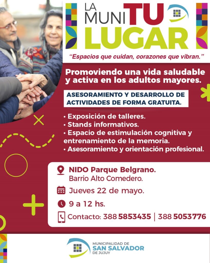 El jueves 22 de mayo, el NIDO Parque General Belgrano será el punto de encuentro para los vecinos interesados en participar del programa “La Muni Tu Lugar”. La jornada ofrecerá diversas actividades gratuitas de promoción y asesoramiento, orientadas a fortalecer estrategias territoriales que promuevan una vida saludable y activa en las personas adultas mayores.