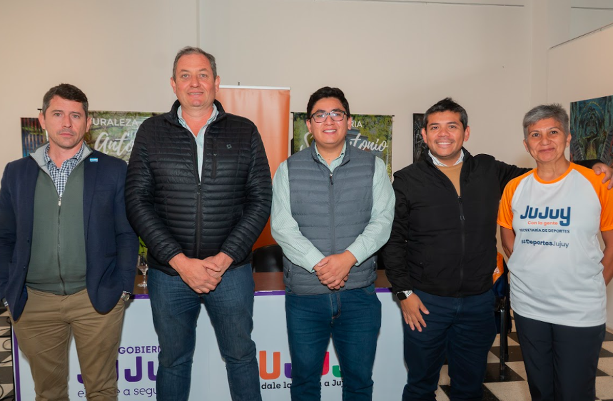 El presidente del Concejo Deliberante de San Antonio, Antonio Fermi, junto al director de Deporte Social y Comunitario de la Secretaría de Deportes de la Provincia, Matías Colqui, acompañado por la profesora Claudia Corbalán, del equipo técnico de la Secretaría de Estado, el presidente del Club Jujeño de Mountain Bike, Esteban Velo, y el director de Turismo de la Municipalidad de San Antonio, Matías Díaz, presentaron ambas competencias.