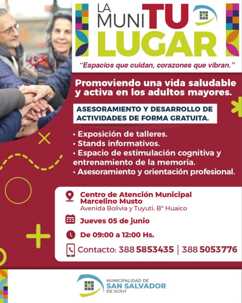 El jueves 5 de junio , el Centro de Atención Municipal Marcelino Musto será el punto de encuentro para los vecinos interesados en participar del programa “La Muni Tu Lugar”. La jornada ofrecerá diversas actividades gratuitas de promoción y asesoramiento, orientadas a fortalecer estrategias territoriales que promuevan una vida saludable y activa en las personas adultas mayores.