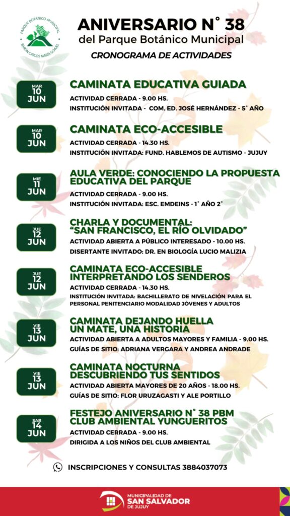 En conmemoración de su 38° aniversario, el Parque Botánico Municipal “Barón Carlos María Schuel” organiza una semana repleta de propuestas educativas, recreativas y ambientales destinadas a instituciones, niños, jóvenes, adultos mayores y público en general. Las actividades se desarrollarán del 10 al 14 de junio en la reserva, ubicado en barrio Los Perales.