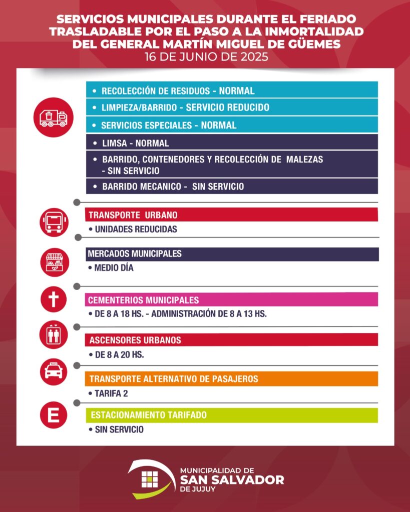 La Municipalidad de San Salvador de Jujuy informó la modalidad de prestación de servicios municipales el día lunes 16 de junio, feriado con motivo de conmemorarse el Paso a la inmortalidad del General Manuel Eduardo Arias y Don Martin Miguel de Güemes.