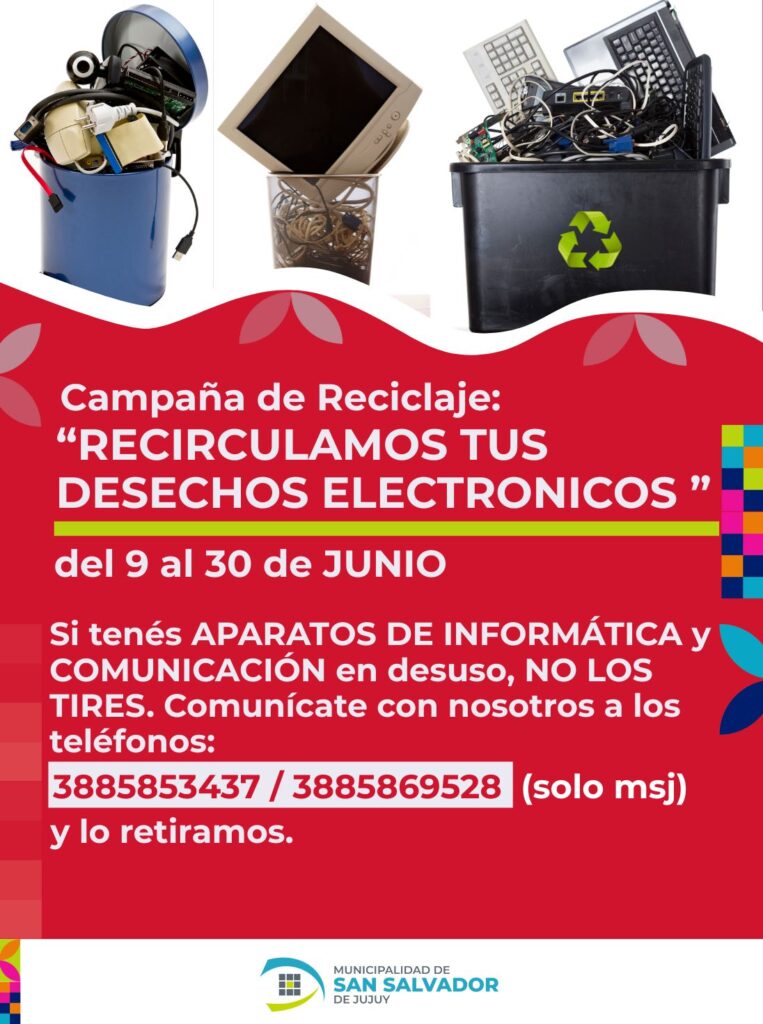 El municipio recuerda que la campaña busca recolectar aparatos electrónicos e informáticos en desuso o dañados. Se invita a los vecinos a no desechar estos elementos con la basura común, ya que personal de la Dirección de Economía Circular puede retirarlos de manera gratuita. Para coordinar el retiro, se debe enviar un mensaje de texto a los números 388-5853437 o 388-5869528.