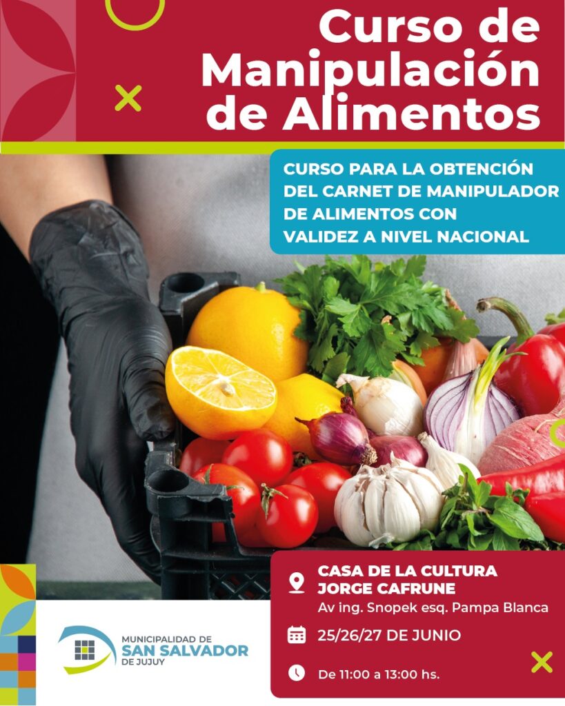 El Ejecutivo Municipal invita a la comunidad a participar del curso de Manipulación de Alimentos que se dictará del miércoles 25 al viernes 27 de junio, en el horario de 11 a 13 horas en las instalaciones de la Casa de la Historia y la Cultura “Jorge Cafrune”, ubicada en la intersección de las calles Carlos Snopek y Pampa Blanca en Alto Comedero.