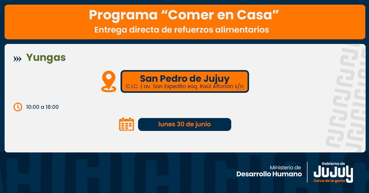 El Ministerio de Desarrollo Humano de Jujuy, mediante la Secretaría de Asistencia Directa, comunica que desde el lunes 30 de junio, se llevará a cabo la entrega directa de módulos alimentarios del Programa “Comer en Casa”, a familias de las localidades de San Pedro, La Mendieta, La Esperanza, Rosario de Río Grande, Rodeíto y Arrayanal.