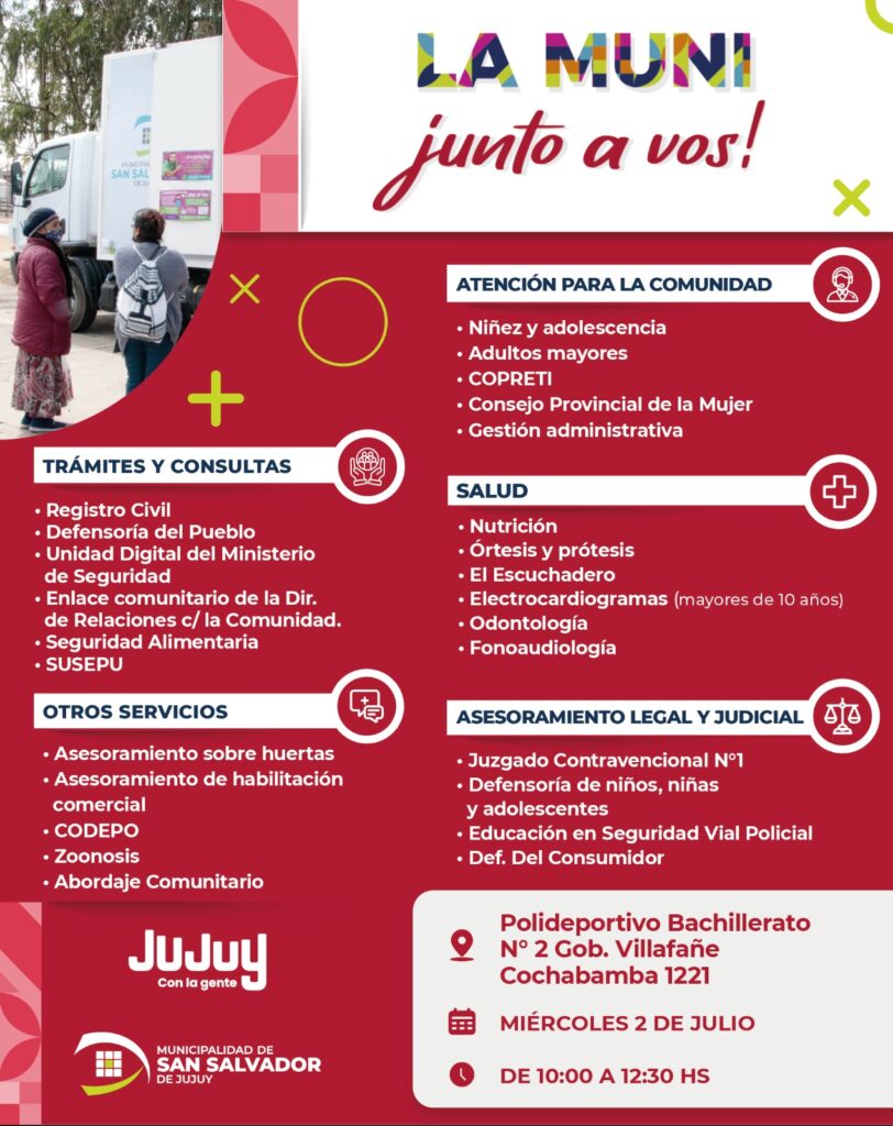 Con el objetivo de acercar los servicios municipales a los vecinos, la Municipalidad de San Salvador de Jujuy llevará adelante una nueva edición del programa “La Muni junto a vos”. La jornada se desarrollará el miércoles 2 de julio en el Polideportivo del Bachillerato N.º 2 Gobernador Villafañe, ubicado en Cochabamba 1221, en el horario de 10:00 a 12:30 hs.