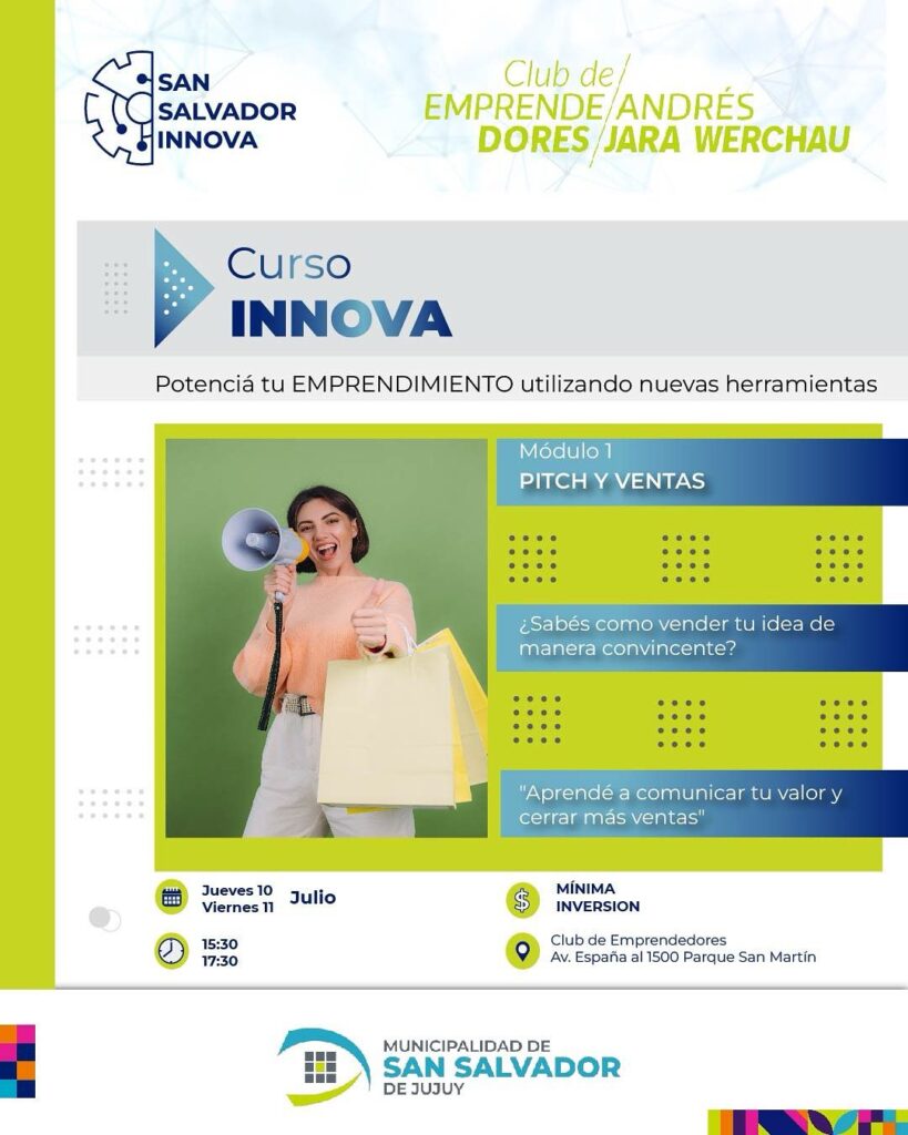 La Municipalidad de San Salvador de Jujuy, a través del Club de Emprendedores, da inicio al Programa INNOVA, una propuesta de capacitación que busca fortalecer los conocimientos y habilidades de emprendedores locales. El primer módulo, titulado “Pitch y Ventas”, se dictará los días jueves 10 y viernes 11 de julio, de 15:30 a 17:30 hs, en la sede del Club ubicada en Avenida España 1500, Parque San Martín.