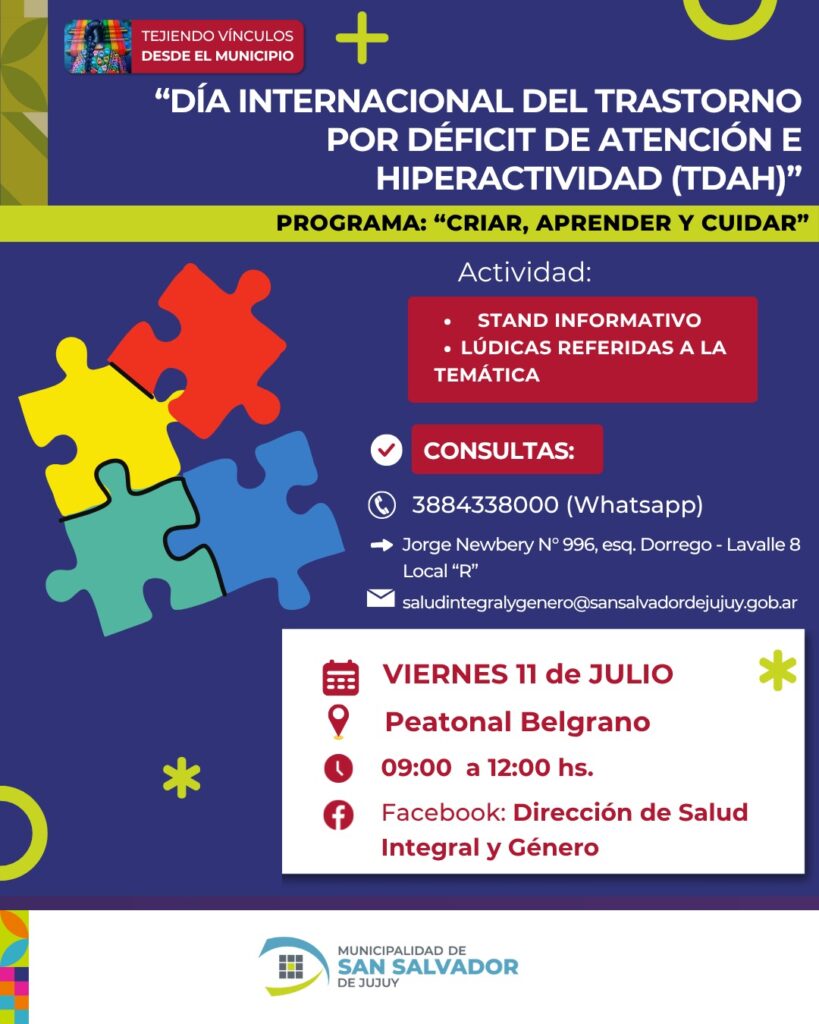 En el marco del Día Internacional del Trastorno por Déficit de Atención e Hiperactividad (TDAH), la Municipalidad de San Salvador de Jujuy llevará adelante una jornada de concientización el próximo viernes 11 de julio, de 9:00 a 12:00 hs., en la Peatonal Belgrano.