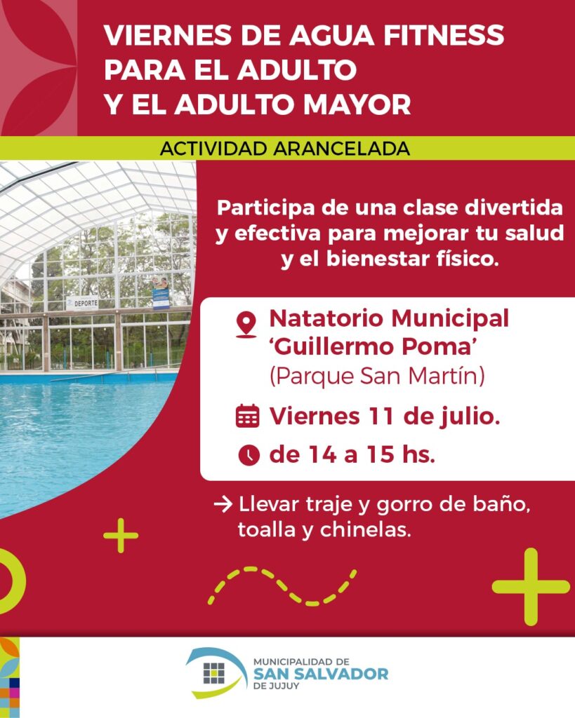 La Municipalidad de San Salvador de Jujuy invita a la comunidad a participar de una jornada de “Agua Fitness” especialmente pensada para adultos y adultos mayores. La actividad se llevará a cabo este viernes 11 de julio, de 14 a 15 horas, en el Natatorio Municipal “Guillermo Poma”, ubicado en el Parque San Martín.