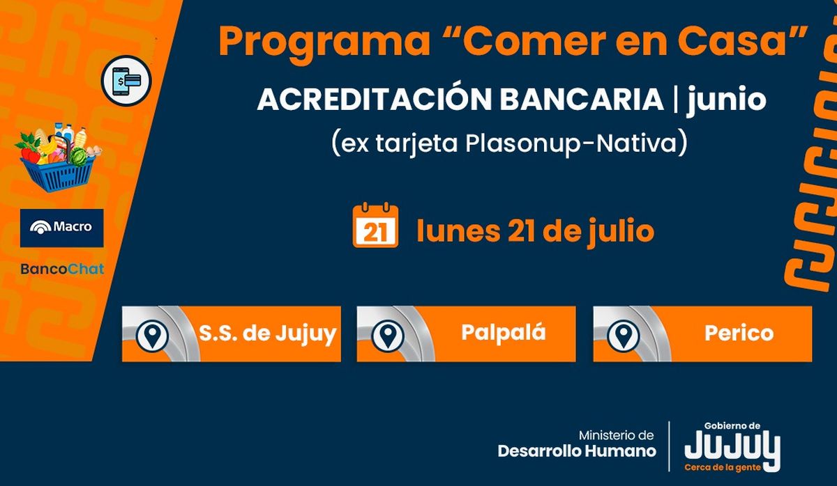 El Ministerio de Desarrollo Humano de Jujuy, a través de la Secretaría de Asistencia Directa, informa que este lunes 21 de julio, se efectuó la acreditación bancaria del Programa “Comer en Casa”, correspondiente al mes de junio, para las y los titulares de las localidades de San Salvador, Palpalá y Perico.