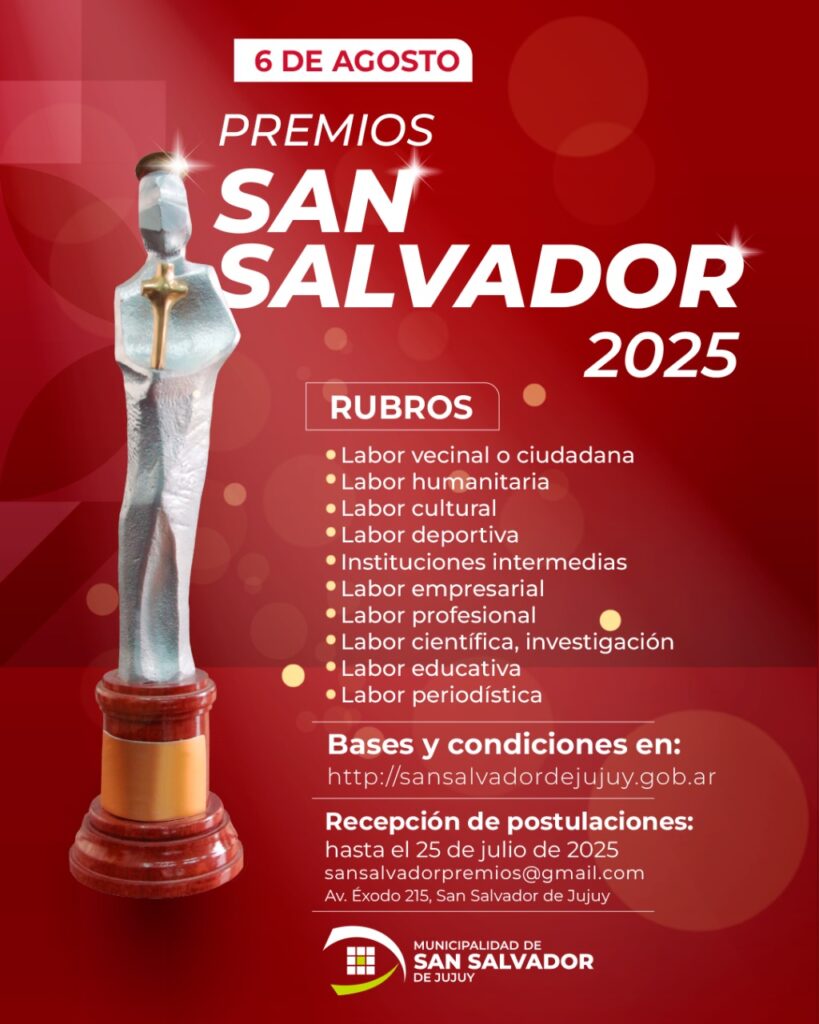 La Municipalidad de San Salvador de Jujuy recuerda a la comunidad que se encuentran abiertas las postulaciones para la 28ª edición de los tradicionales Premios San Salvador, galardones que reconocen a ciudadanos e instituciones que han dejado una huella significativa en sus respectivos ámbitos de actuación, contribuyendo al desarrollo y bienestar de la ciudad y sus habitantes.