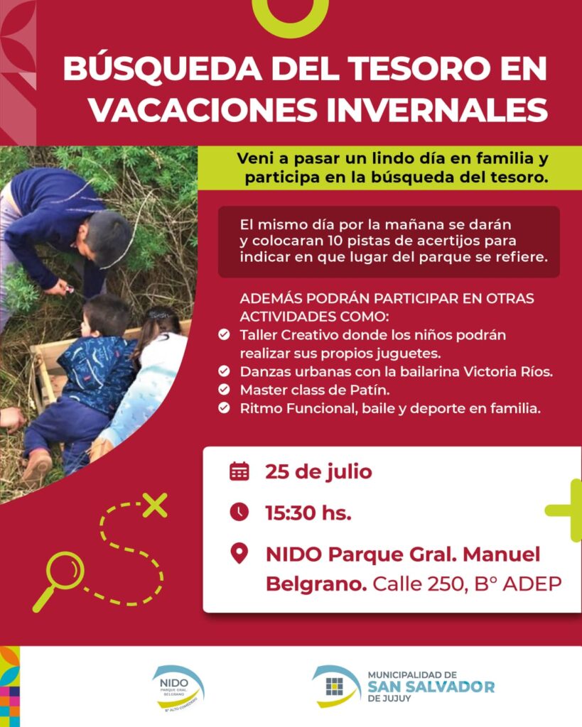 En el marco de las vacaciones invernales, el próximo viernes 25 de julio a partir de las 15:30 horas, el NIDO Parque General Belgrano, ubicado en el barrio Alto Comedero, será escenario de una jornada de diversión y entretenimiento para los más pequeños. La propuesta principal será una “Búsqueda del Tesoro”, una actividad lúdica que desafiará el ingenio de los participantes mediante pistas de acertijos distribuidas en diferentes puntos del parque, incentivando el juego en equipo y la exploración.