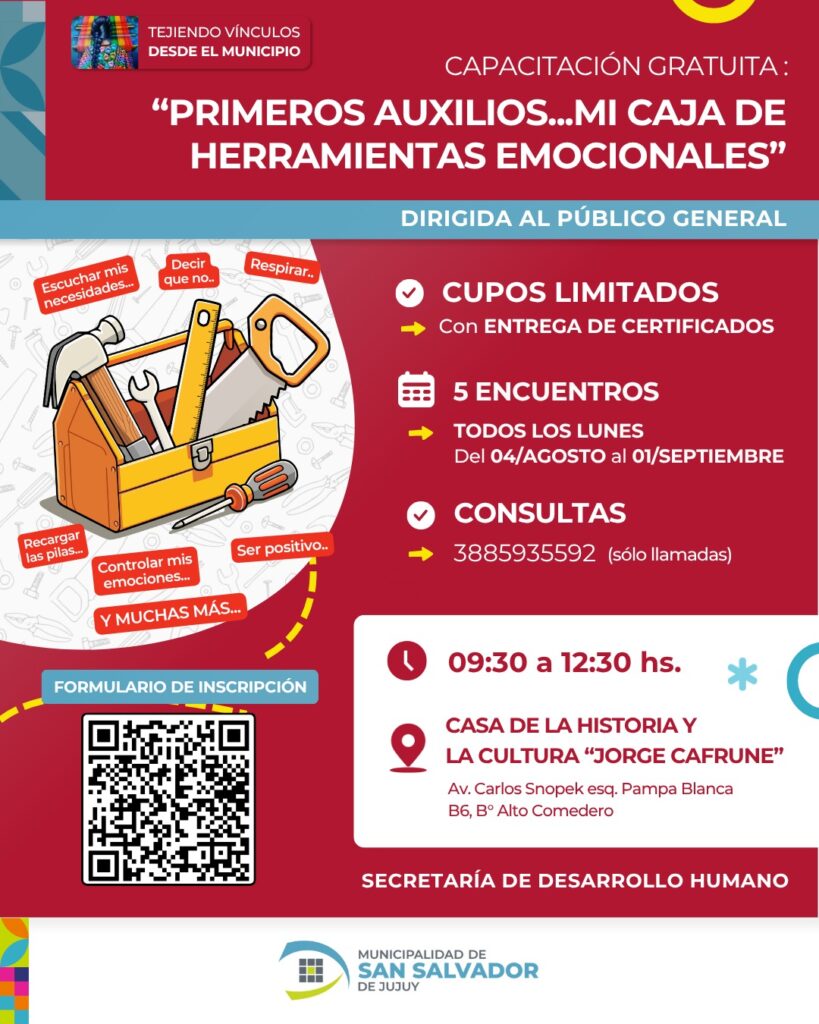 La Municipalidad de San Salvador de Jujuy, a través de la Secretaría de Desarrollo Humano, invita a la comunidad a participar de la capacitación gratuita “Primeros Auxilios… Mi Caja de Herramientas Emocionales”, una propuesta pensada para brindar recursos prácticos de autocuidado y gestión emocional.