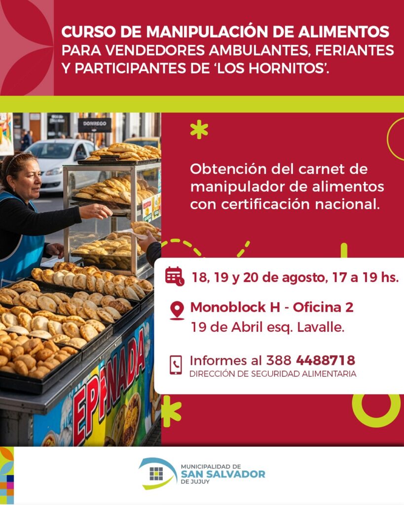 La Municipalidad de San Salvador de Jujuy, a través de la Dirección de Seguridad Alimentaria, anunció nuevas ediciones del Curso de Manipulación de Alimentos destinado a distintos sectores del ámbito gastronómico. La capacitación permite acceder al carnet oficial de manipulador de alimentos con certificación nacional, obligatorio para quienes trabajan con productos alimenticios.