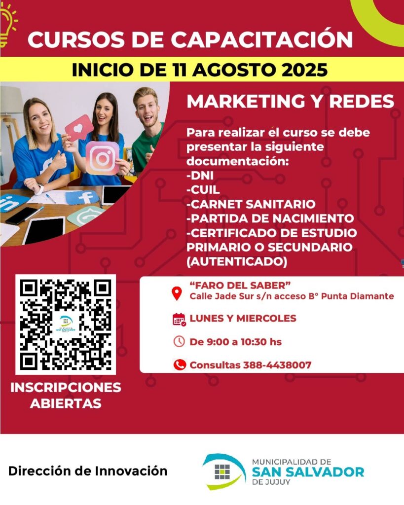 La Municipalidad de San Salvador de Jujuy invita a la comunidad a participar de una nueva propuesta formativa pensada para todos los vecinos y vecinas que deseen capacitarse y potenciar sus habilidades digitales. A partir del lunes 28 de julio, estarán abiertas las inscripciones para los talleres y capacitaciones que se dictarán en el Faro del Saber del barrio Punta Diamante. Los interesados deben ingresar al siguiente enlace para registrar su pre inscripción: formulario