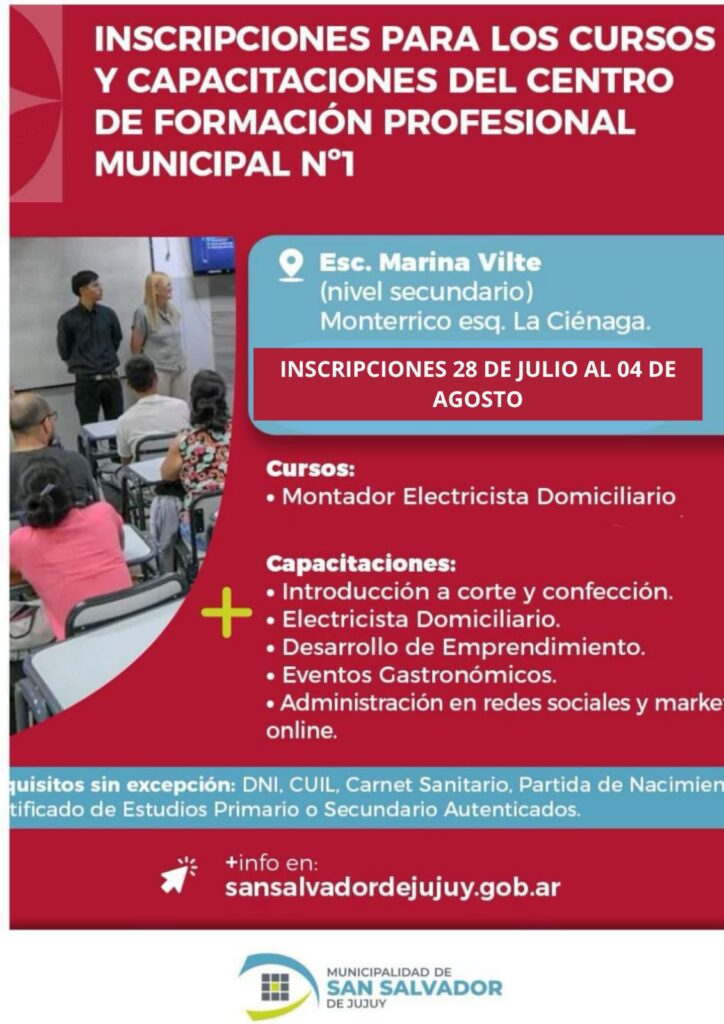La Municipalidad de San Salvador de Jujuy anunció la apertura de inscripciones para los cursos y capacitaciones del Centro de Formación Profesional Municipal N.º 1. La inscripción se realizará del 28 de julio al 4 de agosto, en el horario de 19:30 a 22:30, en la Escuela Marina Vilte (nivel secundario), ubicada en la esquina de Monterrico y La Ciénaga.