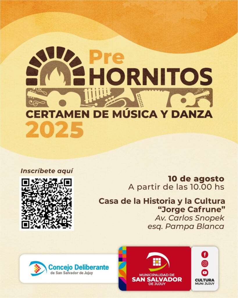 La Municipalidad de San Salvador de Jujuy, a través de la Secretaría de Cultura y Turismo y el Concejo Deliberante, recuerda que se encuentran abiertas las inscripciones para participar del Certamen Folklórico Pre Hornitos 2025, una iniciativa que busca promover la diversidad cultural y brindar oportunidades a músicos y bailarines emergentes de la provincia.