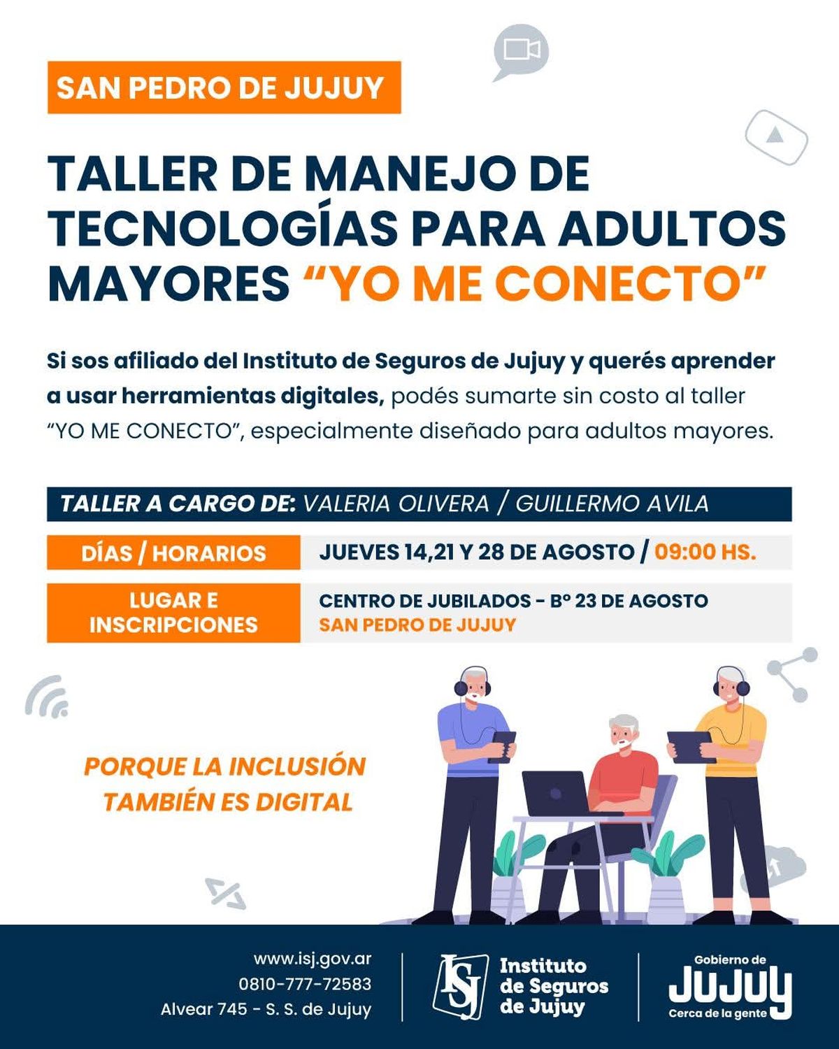 Con el objetivo de acercar las nuevas herramientas a personas mayores, el Instituto de Seguros de Jujuy (ISJ) a través del área de Promoción de la Salud informó el inicio del Taller Itinerante de Manejo de las Tecnologías «Yo me conecto», donde los afiliados podrán aprender a usar herramientas digitales como la credencial digital, botón de pago, redes sociales, reclamos online y mucho más.