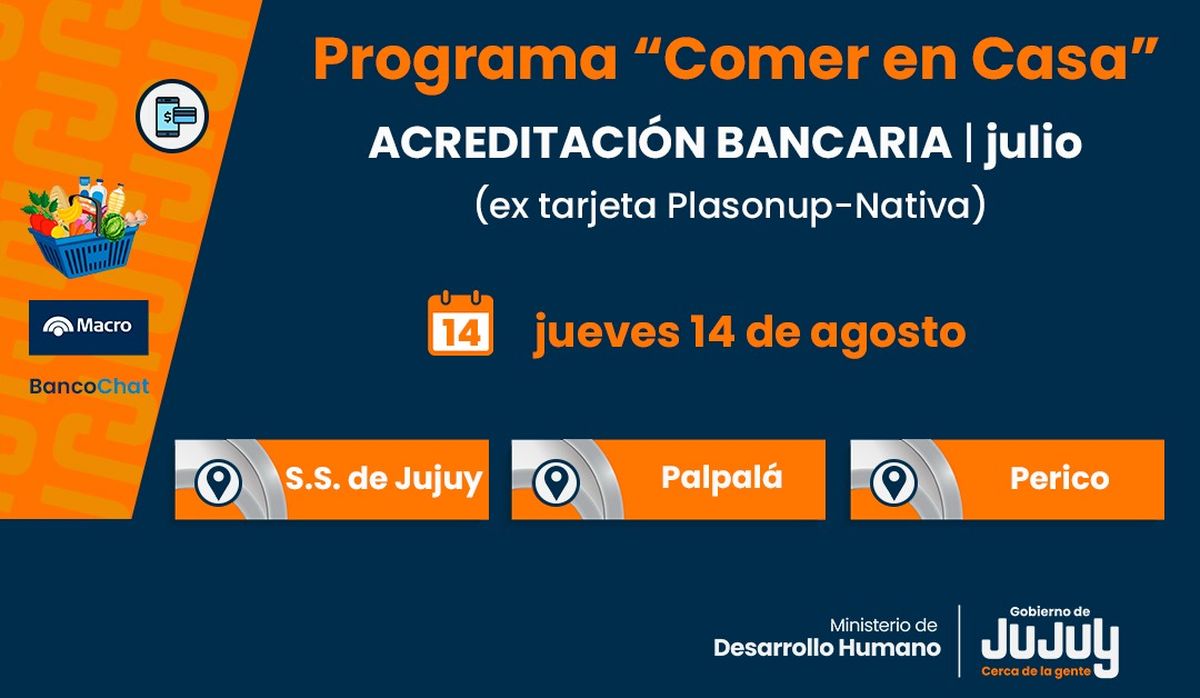 El Ministerio de Desarrollo Humano de Jujuy, a través de la Secretaría de Asistencia Directa, informa que este jueves 14 de agosto, se realizó la acreditación bancaria correspondiente al mes de julio para titulares de San Salvador, Palpalá y Perico.