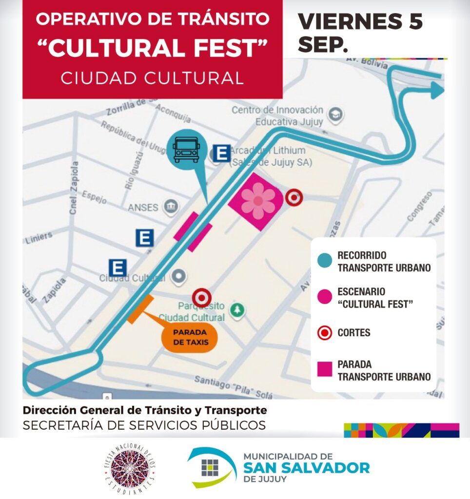 La Secretaría de Servicios Públicos de la Municipalidad, a través de la Dirección de Tránsito y Transporte, informó a la comunidad que, con motivo de la realización del evento “Cultural Fest” este viernes 5 de septiembre en la Ciudad Cultural, se implementará un operativo especial de transporte para facilitar el acceso y la circulación en la zona.