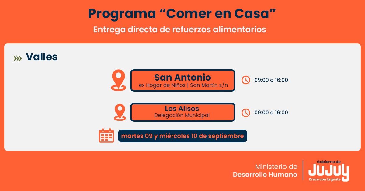 El Ministerio de Desarrollo Humano, mediante la Secretaría de Asistencia Directa, informa que los días martes 09 y miércoles 10 de septiembre, tendrá lugar la entrega directa de módulos alimentarios del Programa “Comer en Casa”, a familias de San Antonio y El Carmen.