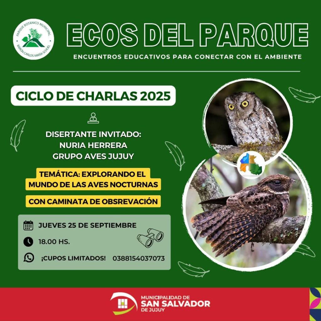 La Municipalidad de San Salvador de Jujuy, invita a la comunidad a participar del nuevo encuentro educativo “Ecos del Parque”, que en esta oportunidad abordará la fascinante charla “Explorando el mundo de las aves nocturnas” y se realizara el próximo jueves 25 de septiembre a las 18:00 hs. en el Parque Botánico Municipal.