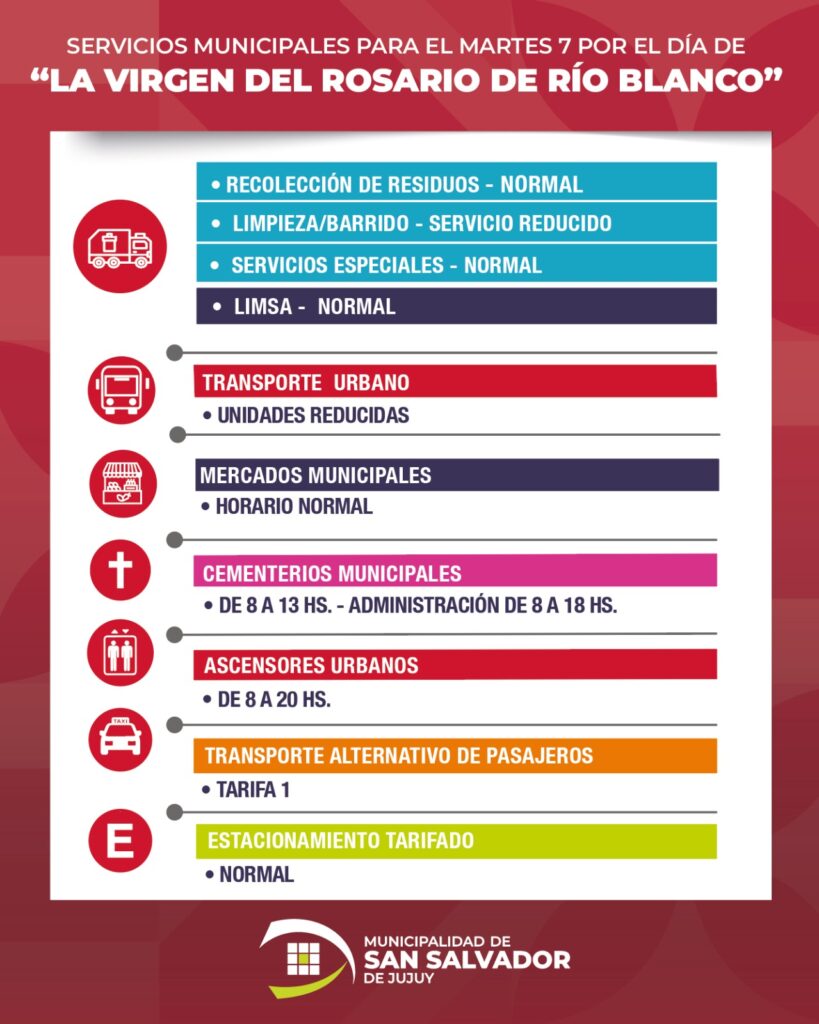 La Municipalidad de San Salvador de Jujuy informó la modalidad de prestación de servicios para el martes 7 de octubre, por ser día no laborable por honras a la Virgen de Río y Blanco y Paypaya