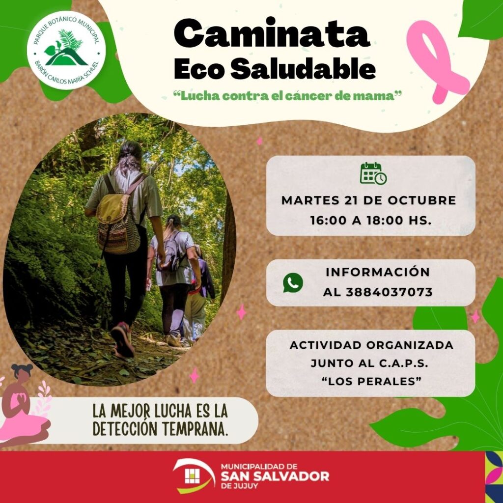 En el marco del Mes Rosa, dedicado a la lucha contra el cáncer de mama, la Municipalidad de San Salvador de Jujuy, a través del Parque Botánico Municipal y en coordinación con el Centro de Atención Primaria de la Salud (CAPS) de Los Perales, invita a la comunidad a participar de la Caminata Eco Saludable, una actividad gratuita destinada a concientizar sobre la importancia de la detección temprana del cáncer de mama.