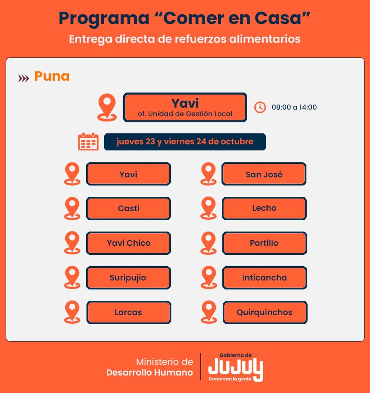 El Ministerio de Desarrollo Humano de Jujuy, por medio de la Secretaría de Asistencia Directa, comunica que los días jueves 23 y viernes 24 de octubre en Yavi, se concretará la entrega directa de módulos alimentarios del programa “Comer en Casa”.