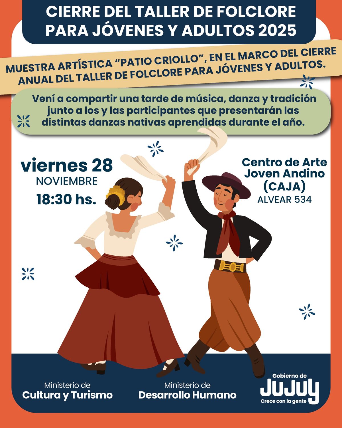 El Ministerio de Desarrollo Humano, a través de la Dirección de Juventud, invita a la comunidad a participar de la muestra artística “Patio Criollo”, en el marco del cierre anual del Taller de Folclore para Jóvenes y Adultos 2025.
