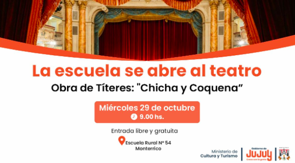 La obra «Chicha y Coquena» llega a la Escuela Rural N° 54 de Monterrico el miércoles 29 de octubre a las 9 de la mañana. La función es libre y gratuita, en el marco del programa La escuela se abre al teatro.
