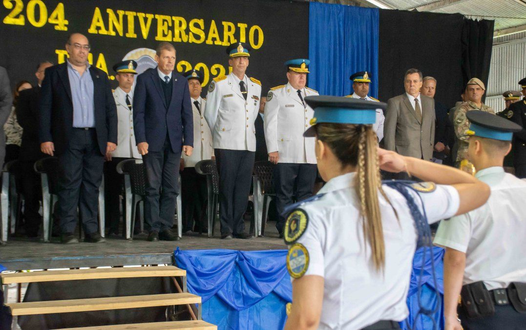 El jefe de la División Operativa Federal, subcomisario Diego Gastón Baud, y el secretario de Seguridad, Juan Manuel Pulleiro, encabezaron el acto de aniversario de la fuerza de seguridad nacional.