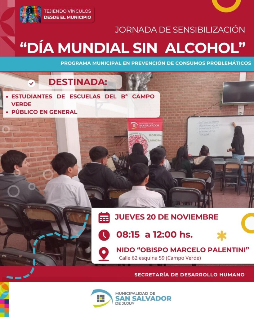 La Dirección de Salud Integral y Genero de la Municipalidad de San Salvador de Jujuy, llevará a cabo este jueves, 20 de noviembre, en el NIDO “Obispo Marcelo Palentini” del barrio Campo Verde, la Jornada de Sensibilización por el Día Mundial sin Alcohol mediante la cual se brindará a los vecinos una serie de propuestas con el objetivo de informar sensibilizar y concientizar acerca de los riesgos del consumo excesivo de alcohol.