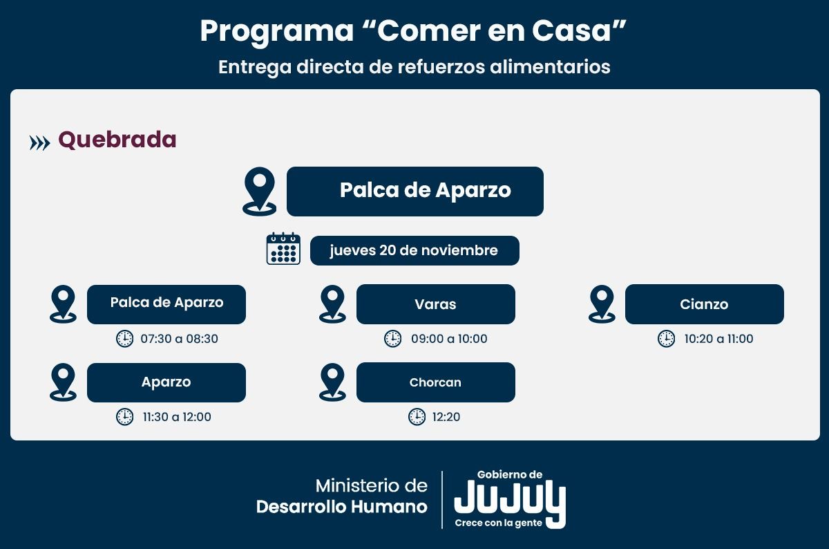 El Ministerio de Desarrollo Humano de Jujuy, a través de la Secretaría de Asistencia Directa informa que este jueves 20 de noviembre en Palca de Aparzo se realizará la distribución de unidades alimentarias del programa “Comer en Casa” de 7:30 a 8:30 horas.
