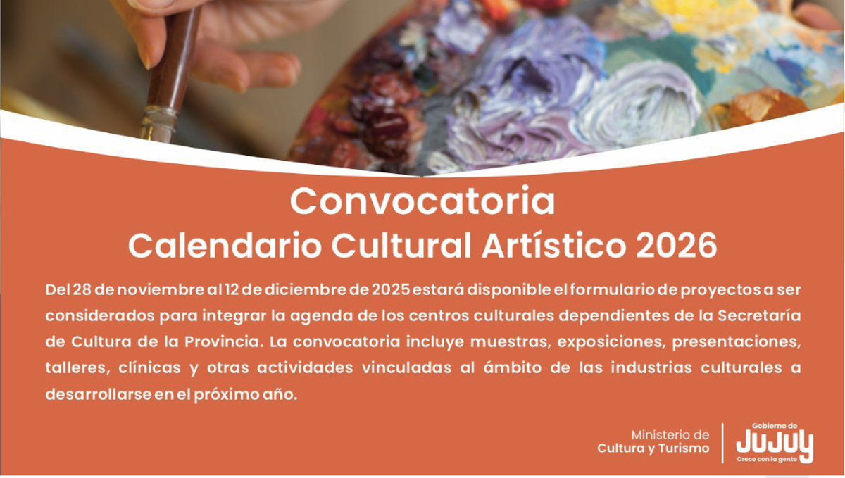El Ministerio de Cultura y Turismo de Jujuy invita a toda la comunidad artística y creativa a participar de la Convocatoria del Calendario Cultural Artístico 2026.