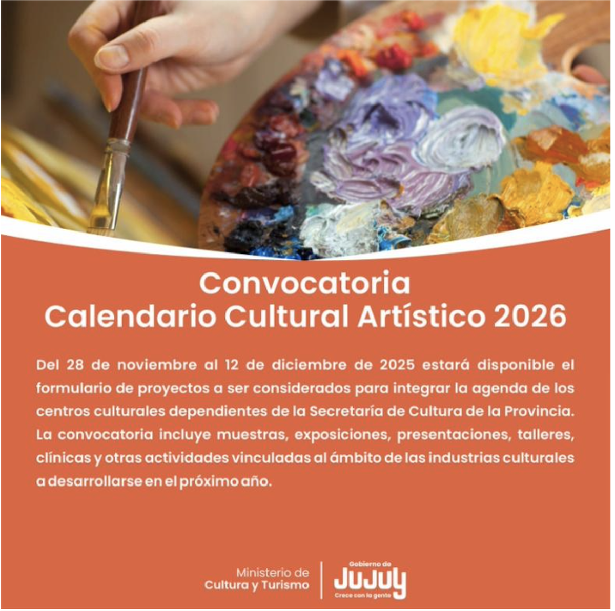 La Secretaría de Cultura de la Provincia anunció la apertura de la convocatoria para el Calendario Cultural Artístico 2026, destinada a seleccionar proyectos que formarán parte de la programación anual de sus espacios culturales.