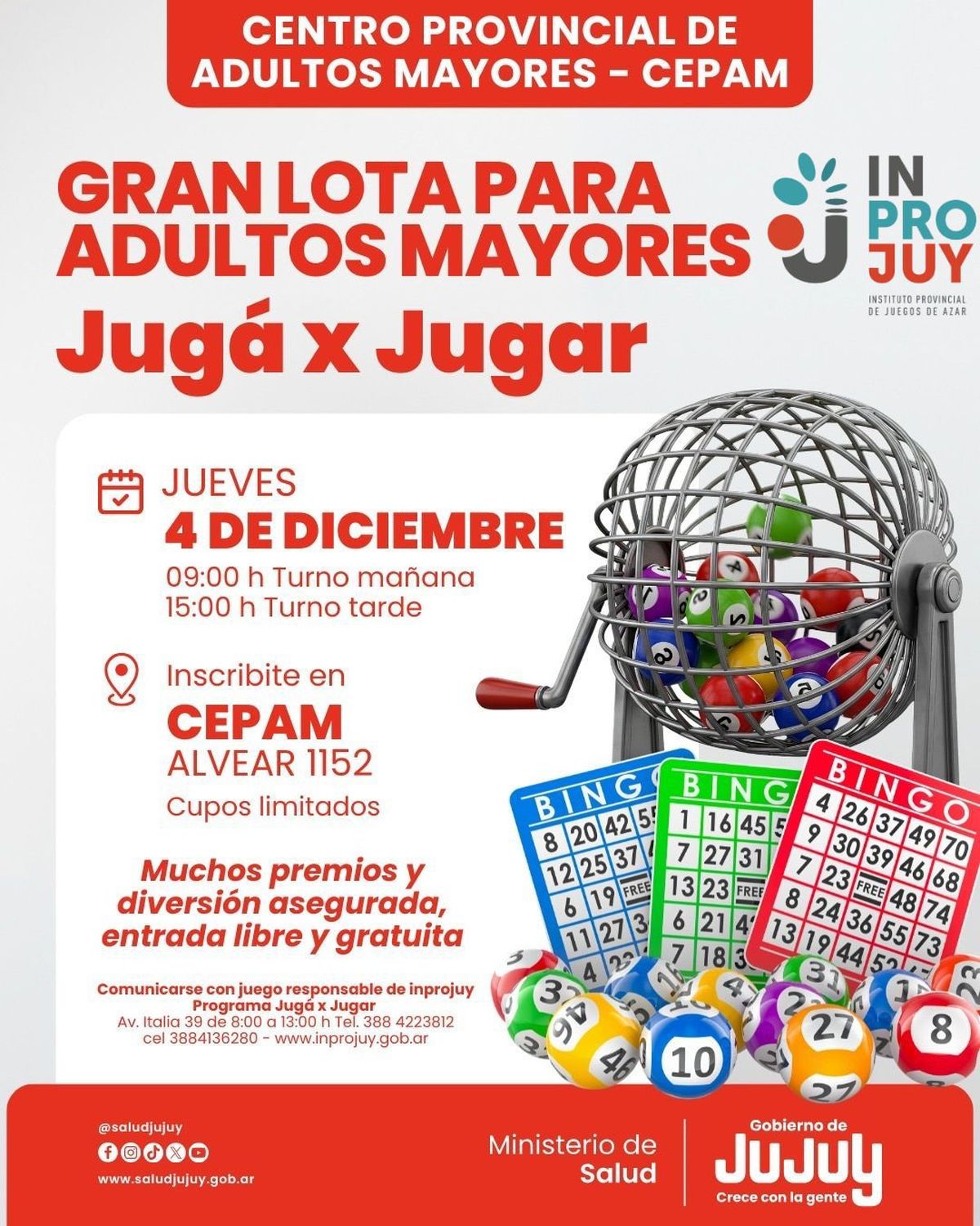 El próximo jueves 4 de diciembre, el Centro Provincial de Adultos Mayores (CEPAM) y el Instituto Provincial de Juegos de Azar de Jujuy (INPROJUY) llevarán adelante una jornada especial destinada a personas mayores, con el propósito de promover espacios de encuentro, recreación, socialización y formación en hábitos de juego responsable.